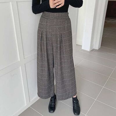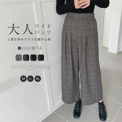 ワイドパンツ レディース 秋冬 チェック柄 無地 ガウチョパンツ タック入り 後ろゴム ハイウエスト フレアパンツ ボトムス パンツ 美脚 おしゃれ カジュアル きれいめ 落ち感 フェミニン 通勤 O