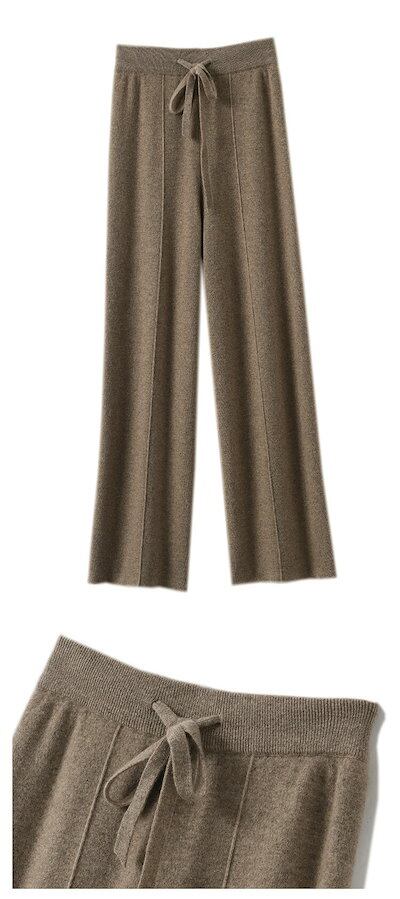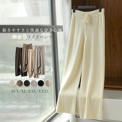 ニットパンツ ストレートパンツ レディース 秋冬 ガウチョパンツ パンツ ロングパンツ ワイドパンツ ロング丈 冬 ウェストゴム 体型カバー リボン付き ニット 長ズボン 暖かい ボトムス カジュアル