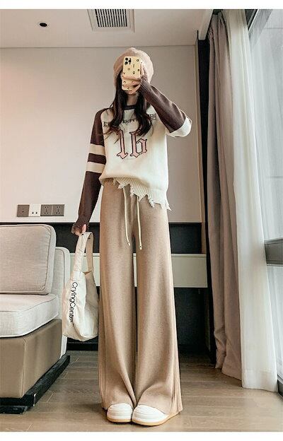 ワイドパンツ 秋冬 ガウチョパンツ パンツ レディース ロングパンツ フレアパンツ ニット パンツ ニットパンツ ロング丈 秋物 ウェストゴム 体型カバー リボン付き ニットワイドパンツ 長ズボン ガ