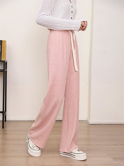 ストレートパンツ 秋冬 ガウチョパンツ パンツ レディース ロングパンツ ニット パンツ ニットパンツ ワイドパンツ ロング丈 秋物 ウェストゴム 体型カバー リボン付き ニットワイドパンツ 長ズボン