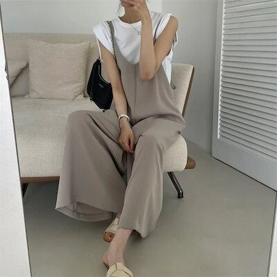 オールインワン サロペット ロングパンツ レディース ワイドパンツ シフォン 落ち感あり ポケット フレア キャミ 春夏秋 ゆったり 体型カバー 大きいサイズ 着?せ 大人 シンブル カジュアル お