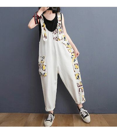 オーバーオール サロペット レディース パンツ 春 夏 秋 オールインワン ゆったり ロング丈 ワイドパンツ 着痩せ ズボン プリント ボトムス 大きいサイズ カジュアル サイドポケット 20代 3