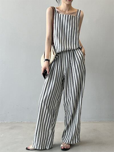セットアップ レディース 夏 春 2点セット パンツドレス パンツスーツ ノースリーブ ロングパンツ ガウチョパンツ ワイドパンツ ゆったり タンクトップ キャミソール ストライブ柄 韓国風 上下 普