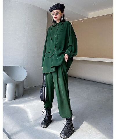 セットアップ レディース 秋 レディース きれいめ セットアップ 春 秋 フリーサイズ グリーン ブラック 個性デザイン ブラウス ワイドパンツ 2点セット ゆったり 上品 おしゃれ 大き