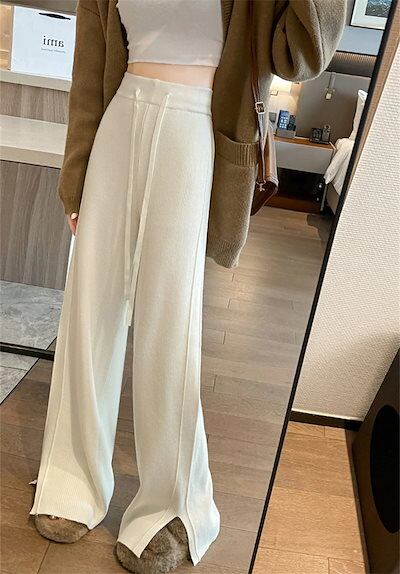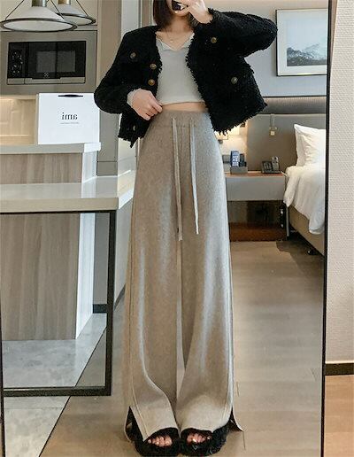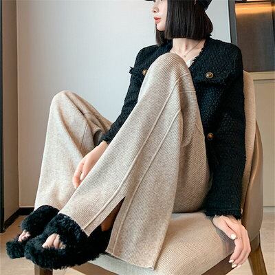 ニットパンツ レディース リブパンツ ワイドパンツ サイドスリット 4色 秋 冬 春リブ ウエストゴム ガウチョパンツ ハイウエスト ストレートパンツ 暖かい プリーツパンツ リブニット パンツ 無地