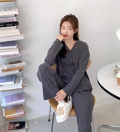 パジャマ レディース 長袖 前開き 秋 春 冬 ルームウェア セットアップ パンツ 部屋着 上下セット 2点セット vネック ロングパンツ ワイドパンツ 大人 寝巻き ナイトウェア ゆったり 秋冬 ウ
