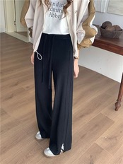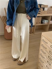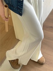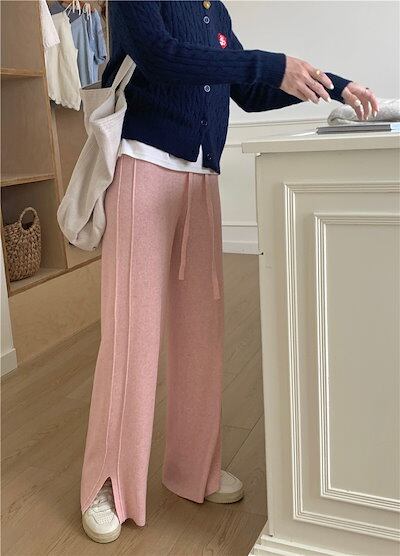 ニットパンツ レディース リブパンツ ワイドパンツ サイドスリット 4色 秋 冬 春リブ ウエストゴム ガウチョパンツ ハイウエスト ストレートパンツ 暖かい プリーツパンツ リブニット パンツ 無地