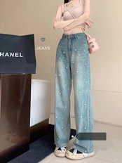 脚長効果!スキニーデニムパンツ 韓国ファッション デニムパンツ レディース 美脚 パンツ ワイドパンツ ロングパンツ春夏秋パールズボンワイドパンツ レディースデニムパンツメガ割