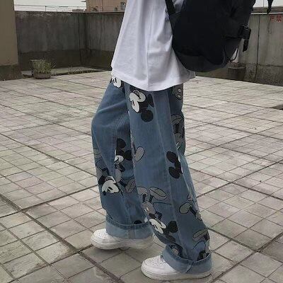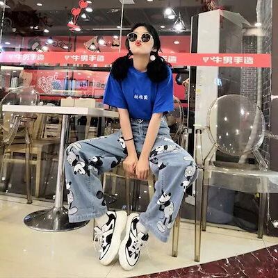 2024年 韓国 ミッキーマウス 漫画 プリント ライトカラー メンズ レディース ルーズ ハイウエスト ストレート ワイドレッグ カジュアル ジーンズ ジーンズ