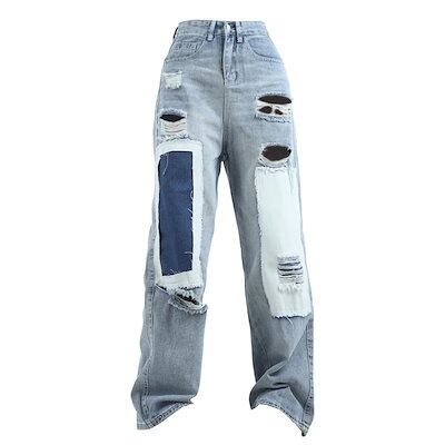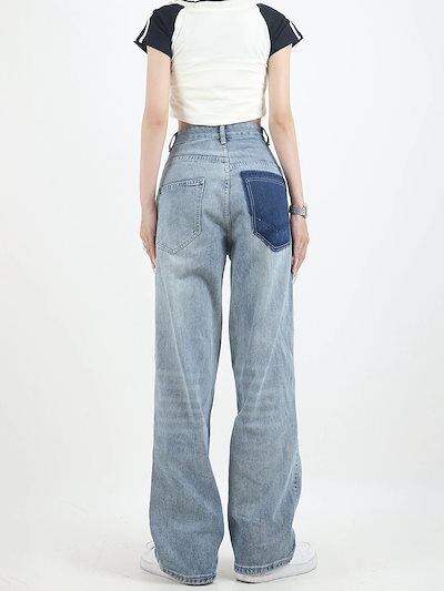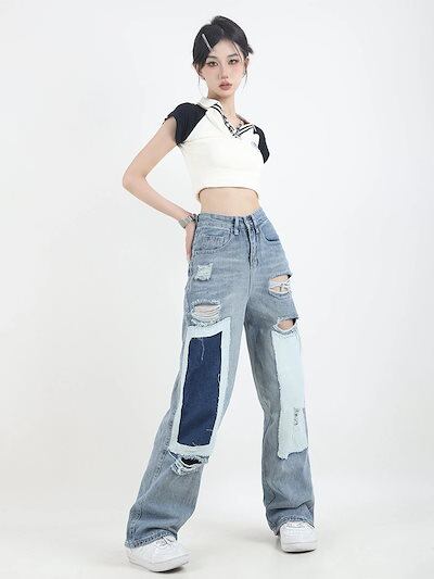新しい レトロスイートガールジャズストリートリップドジーンズレディース新しいパッチストレートハイウエストワイドレッグパンツトレンディ