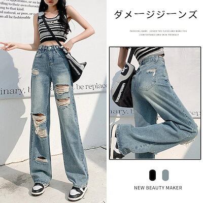 2024新作 ワイドパンツ ダメージジーンズ レディース 夏 新商品 ハイウェスト ゆったり 着痩せ デザイン感 調節可能 九分丈パンツ