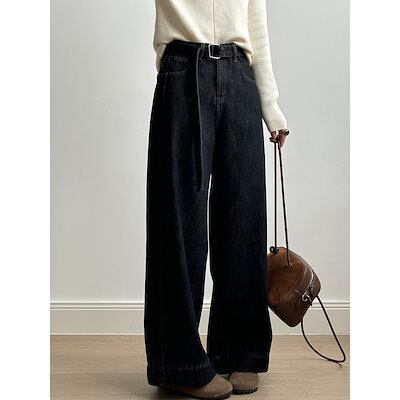 暖かい パッド入り ストレートジーンズ レディース 2024 冬 ハイウエスト カジュアル ワイドパンツ ベルト付き
