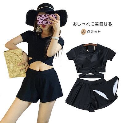 水着 体型カバー 韓国 水着 レディース タンキニ 黒 スカート オトナ女子 水着 セパレート ノーンワイヤー 露出控えめ