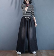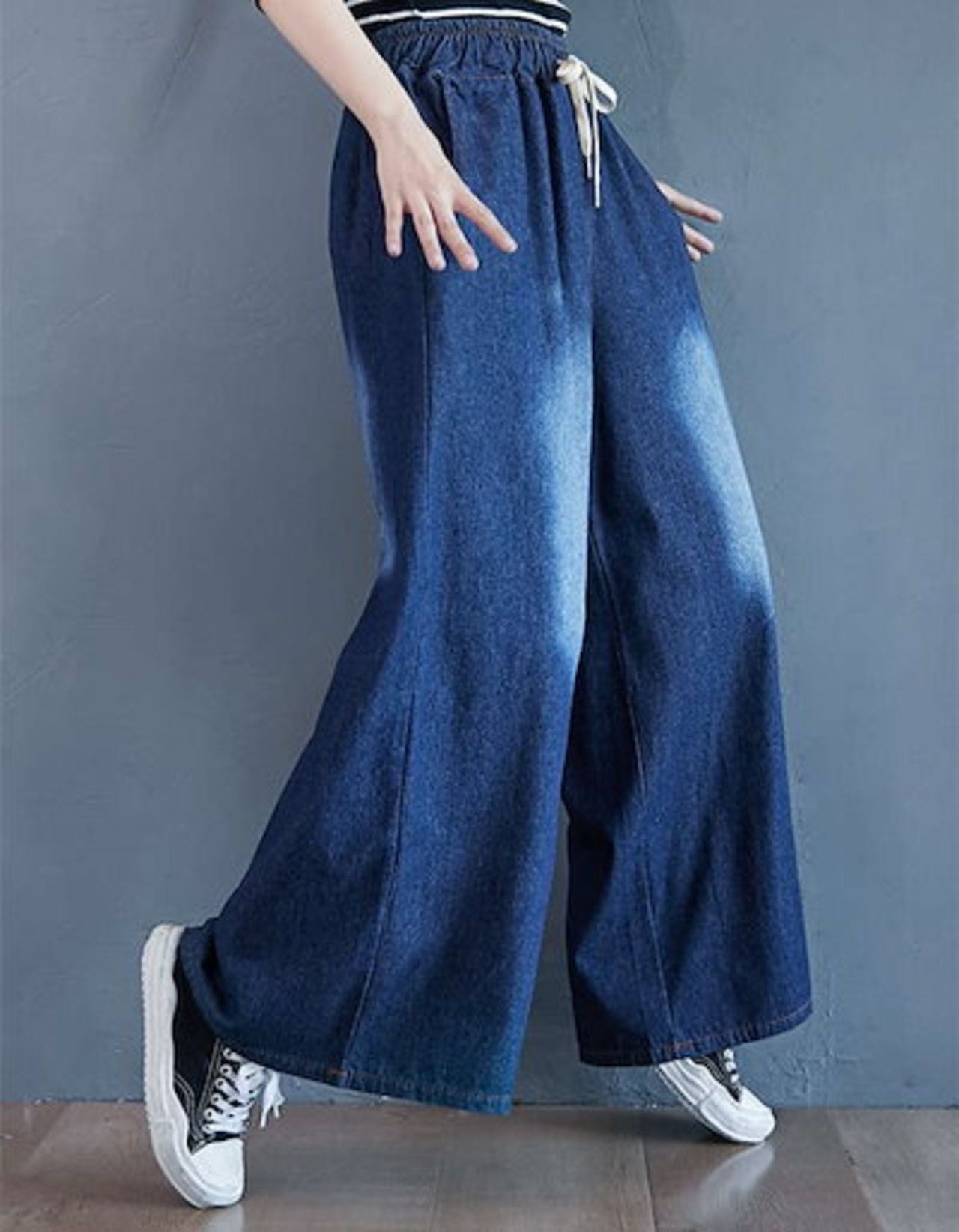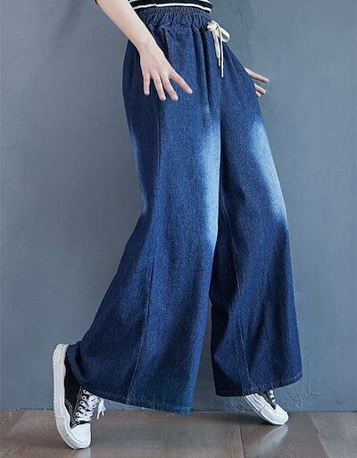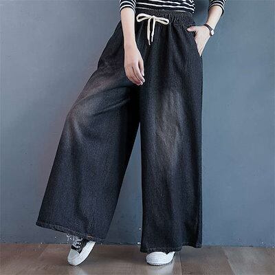 パンツ ワイドパンツ デニム レディース デニムワイドパンツ 大きいサイズ ガウチョ ガウチョパンツ 春 夏 無地 ロング丈 ロングパンツ ポケット付き ウエストゴム リボン付き ボトムス リラックス