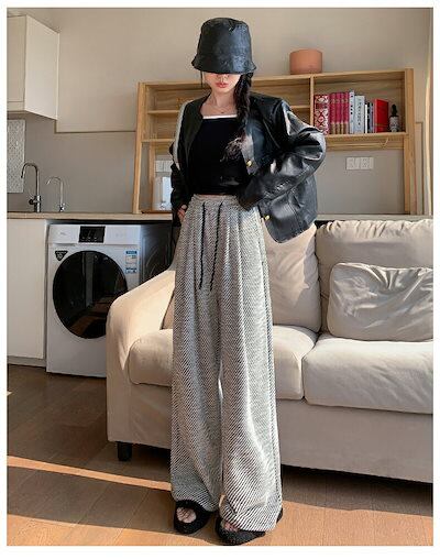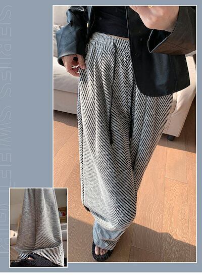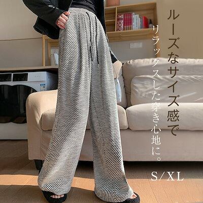 ワイドパンツ 斜めストライプ パンツ レディース きれいめ イージーワイドパンツ 秋 冬 ロングパンツ ハイウエスト ウエストゴム ボトムス ワイドパンツ ゆったり 体型カバー 大きいサイズ パンツ