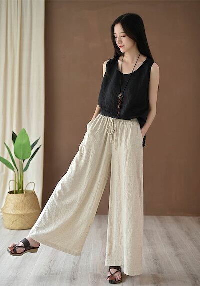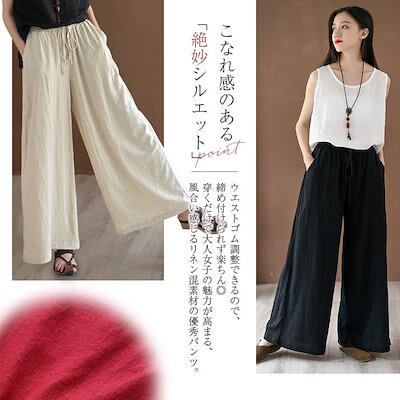 ワイドパンツ レディース 夏 ガウチョパンツ 大きいサイズ リネン パンツ イージーパンツ パンツ ガウチョ ボトムス ウエストゴム リラックス カジュアル 無地 ロングパンツ ナチュラル ゆ