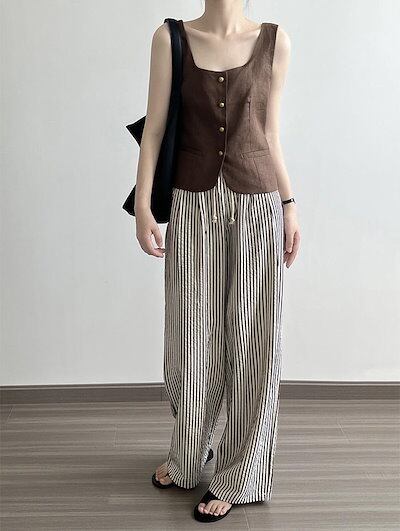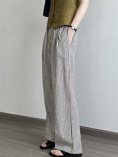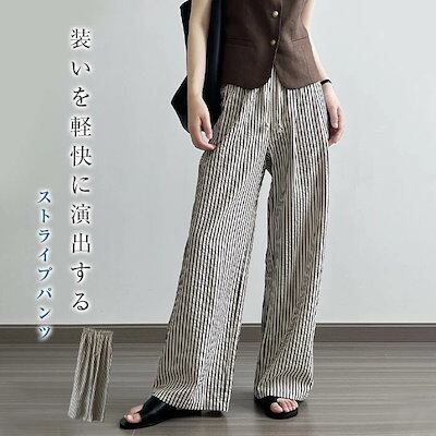 パンツ レディース ガウチョパンツ ストライプ ワイドパンツ きれいめ 春 夏 ガウチョ ワイド ボトムス ウエストゴム 大きいサイズ ワイドシルエット 大きめ ゆったり 体型カバー リゾート 旅行