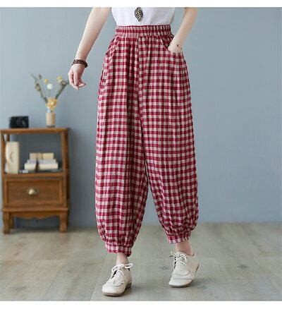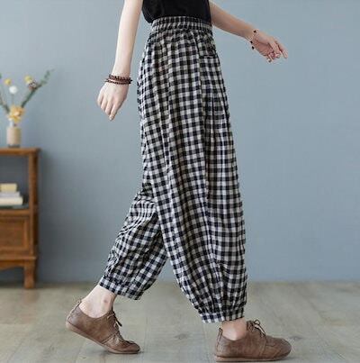 ハロンパンツ レディース バルーンパンツ 春 夏 秋 ワイドパンツ 大きいサイズ サルエルパンツ ボトムス ハロンパン チェック ロングパンツ イージーパンツ 綿麻混風 体型カバー チェック柄 着痩せ