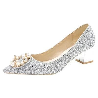 ビジュー付き パンプス キラキラ ハイヒール 太ヒール ラメ ポインテッドトゥ ピンヒール ラインストーン ヒール レディース パーティー 披露宴 謝恩会 お呼ばれ 同窓会 二次会 美脚 結婚式 卒業
