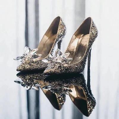 メガ割 ラインストーンハイヒールシンデレラシューズ女性パンプス先のとがったつま先女性クリスタル福袋