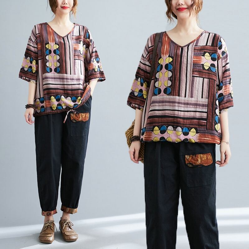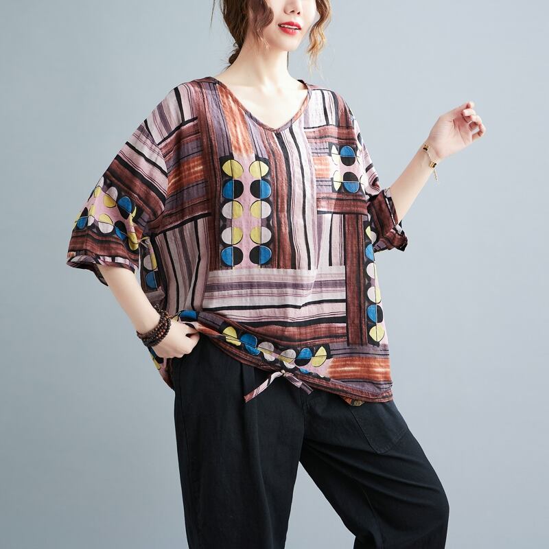 初回送料無料夏新作レデイーストップスカラフルブラウスコットンリネンVネックプラスサイズTシャツ