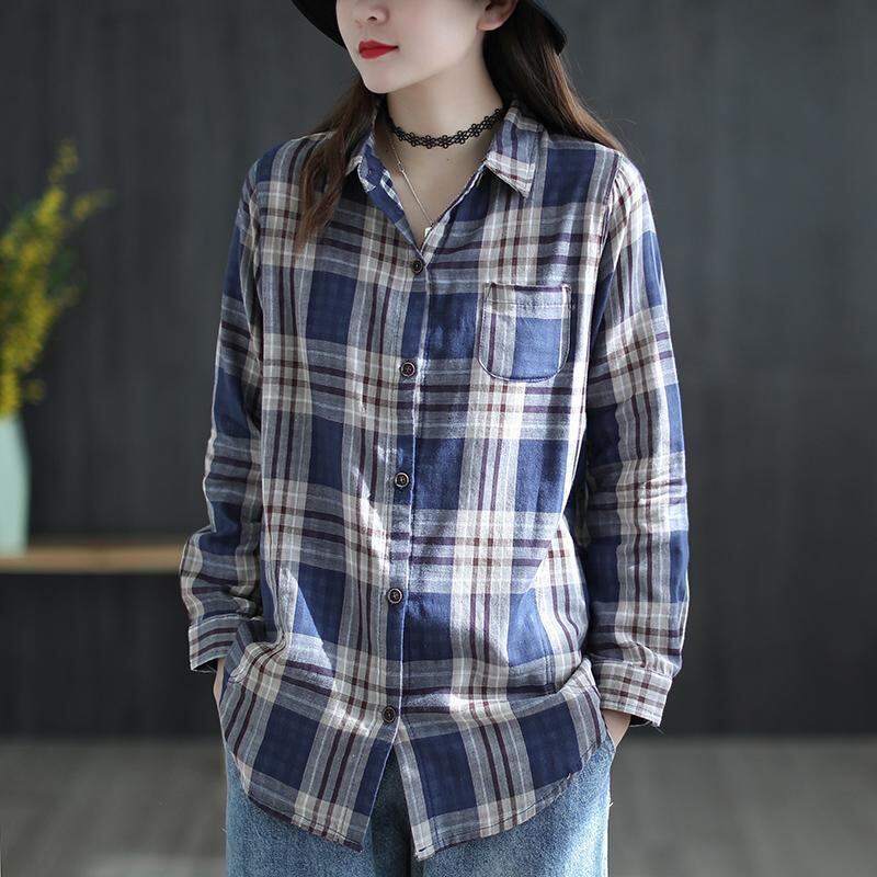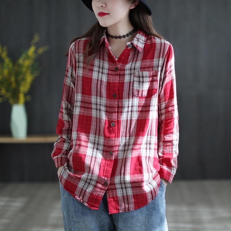 初回送料無料コットンとリネンのチェック柄ゆったりサイズロングスリーブシャツトップス