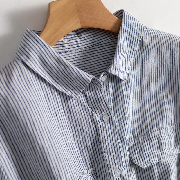 初回送料無料リネンゆったりサイズ長袖ストライプシャツカジュアルトップス