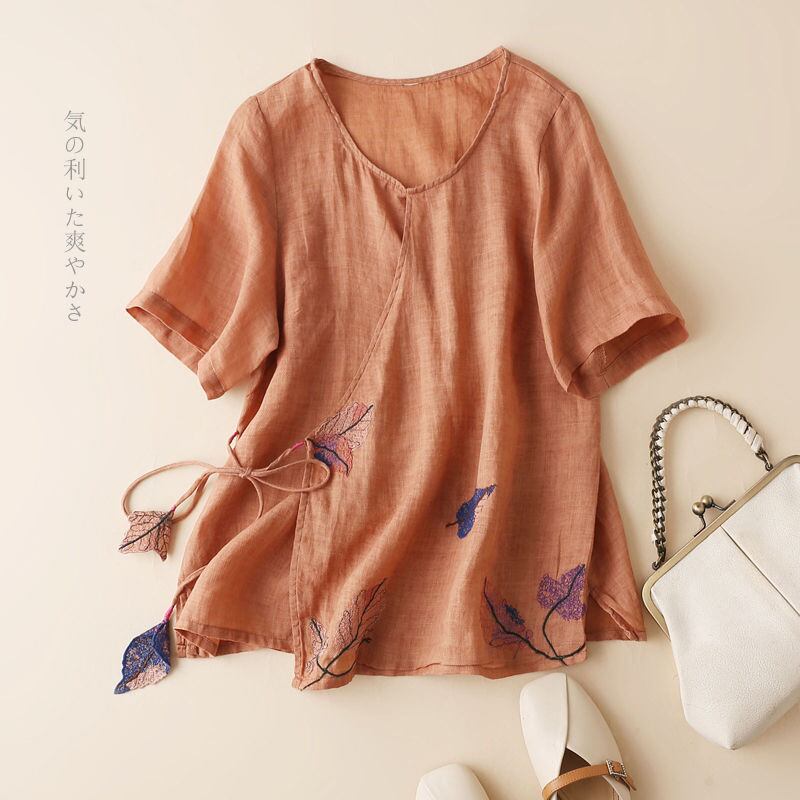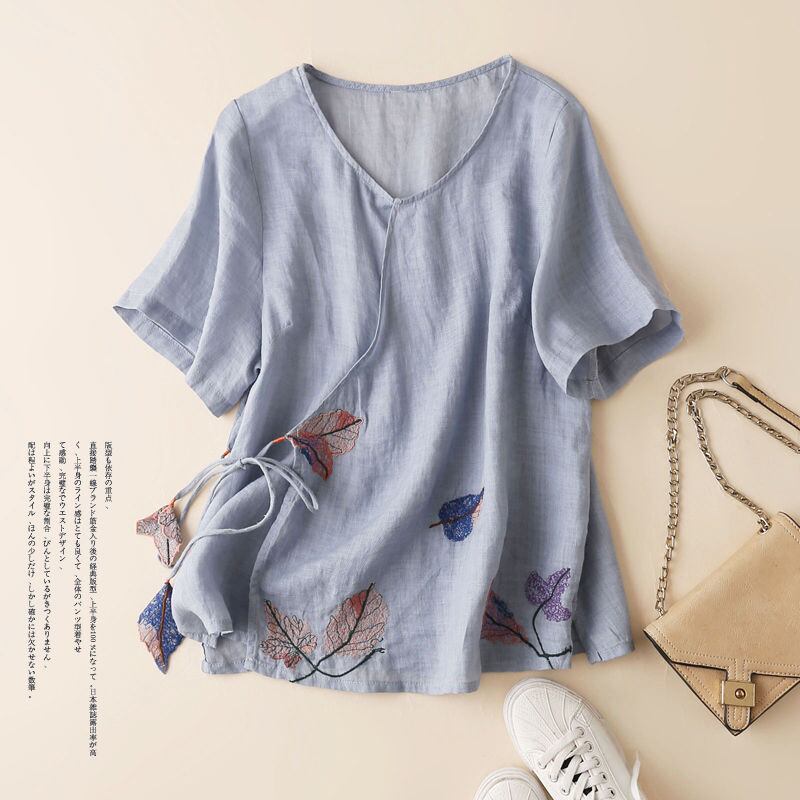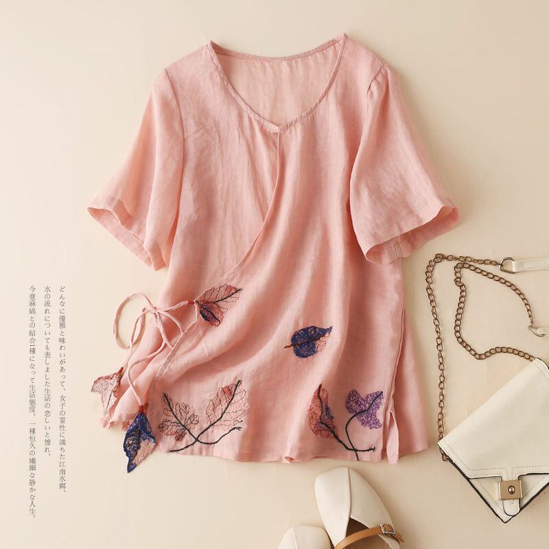 初回送料無料夏新作トップス ブラウス Tシャツ綿リネン半袖刺繍トップス
