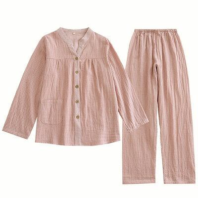ダブルガーゼ パジャマ レディース ルームウェア パンツ 春 秋 ガーゼコットン キーネック チェック 春秋 長袖 ガーゼ 2重ガーゼ 綿 部屋着 セットアップ 2点セット ナイト 寝間着 寝巻き 上