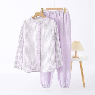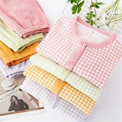 千鳥柄 ガーゼ パジャマ レディース ルームウェア パンツ 春 秋 ガーゼコットン クルーネック 総柄 春秋 長袖 ダブルガーゼ 2重ガーゼ 綿 部屋着 セットアップ 2点セット ナイト 寝間着 寝巻