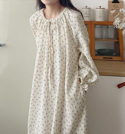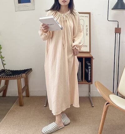 ガーゼ ルームウェア ワンピース 長袖 綿100% 可愛い 大人 春秋 綿 パジャマ ワンピース レディース 春 秋 ランジェリー 部屋着 寝巻き ナイトウェア ネックリボン ギャザー 袖口シャーリン