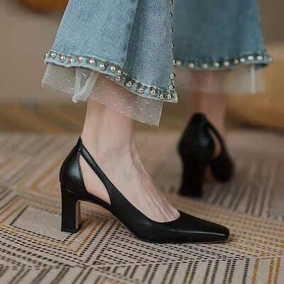 スタイルアップ!ヒールパンプス 韓国ファッション ヒールパンプス 走れるパンプス ローヒール シューズ 新作 痛くない レディース 透かし彫り 太ヒール ポインテッドト 美脚