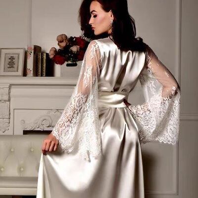 レディース トップス ルームウェア パジャマ 羽織 前開き マキシ 長袖 フェミニン レース 刺繍 ハイウエスト 透け感 シースルー 切り替えデザイン ドッキング サテン 異素材ミックス かわいい