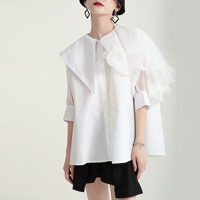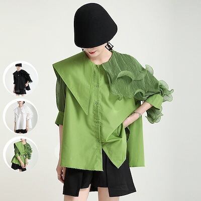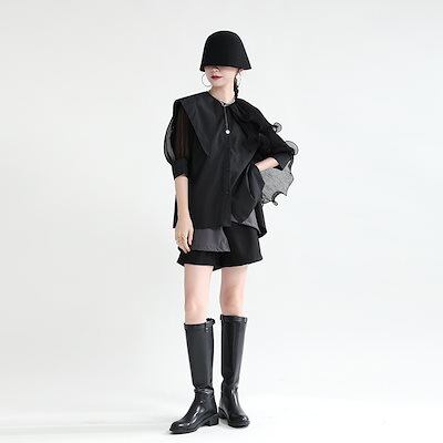 【J.Fashion】 フリルブラウス 「短/長2タイプ」 おしゃれ チュニック 2way ドッキング レディース シャツ ベルト付き半袖 体型カバー レース 日焼け止め 韓国 ロンT メガ割