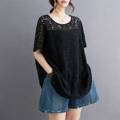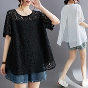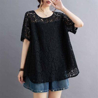 「ファットガール」 2024夏新品 レースブラウス 裏地付き 透かし彫り 大きいサイズ 体型カバー レディース Tシャツ ロンT メガ割