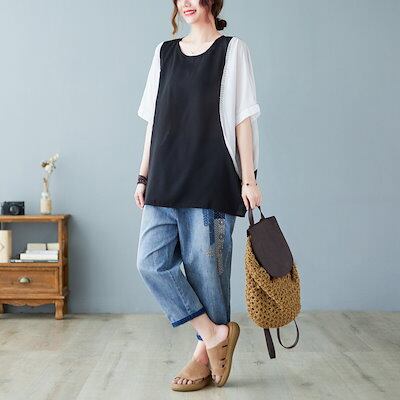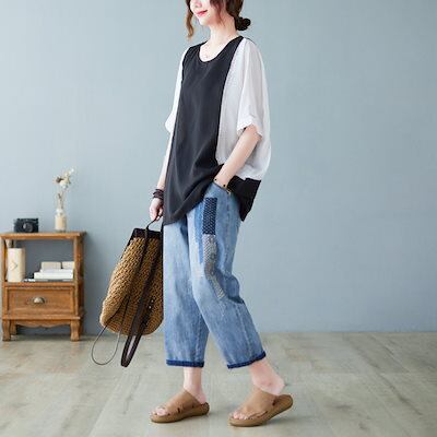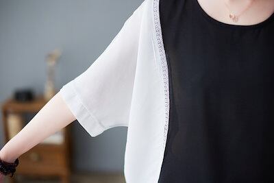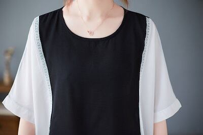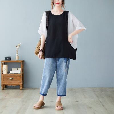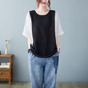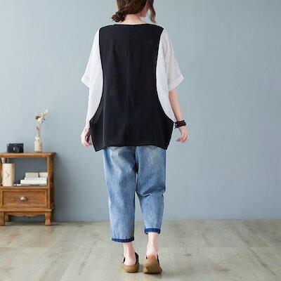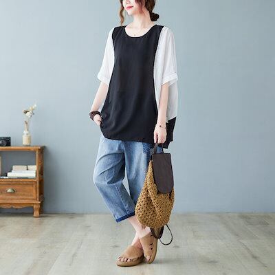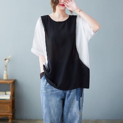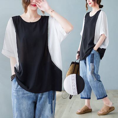 「ファットガール」 2025夏新品 ドッキング Tシャツ 七分袖 大きいサイズ 体型カバー レディース レース ブラウス メガ割