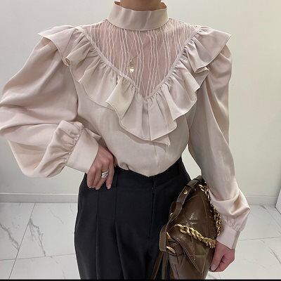 韓国 ブラウス 少し透ける カットソー シフォン 体型カバー シャツ 切り替えレース 高級感 ランタン袖 ラッフル シアーシャツ トップス ゆったり 気質 Tシャツ シャツ 長袖 レディース