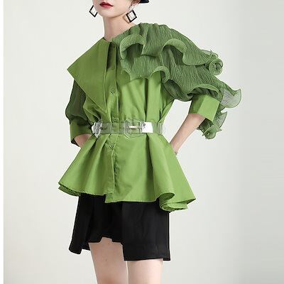 【J.Fashion】 フリル レース飾り ドッキング ブラウス 半袖 レディース シャツ ベルト付き おしゃれ トップス 日焼け止め メガ割