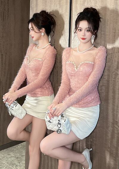 【JY.上品】 春 レース ブラウス vネック ピンク ダイヤモンド飾り レディース ブラウス パーティー キャバ 大人 同窓会 披露宴 卒業式 結婚式 演奏会 ウェディング 二次会 メガ割