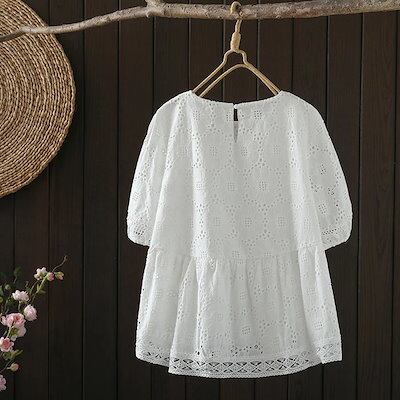 チュニック 大人可愛い チュニックブラウス レディース フレアブラウス 刺? レース 五分袖 ブラウス 夏 トップス 綿混 クルーネック 森ガール エスニック キレイめ カジュアル 春 夏 秋 大人可