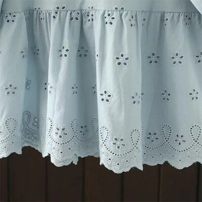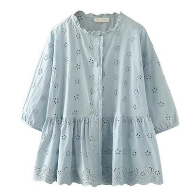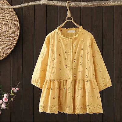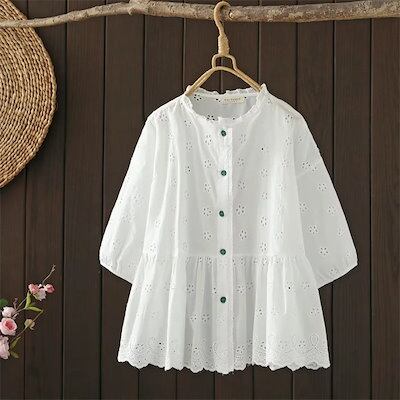 コットンレースブラウス ボリューム袖 チュニックブラウス レディース 夏 五分袖 ブラウス 刺繍花柄 レース フリル襟ブラウス トップス 立ち襟シャツ 綿混 森ガール キレイめ カジュアル 大人可愛