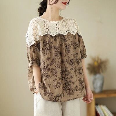 チュニック ブラウス レディース 五分袖 Tシャツ プルオーバー レース 刺繍 チュニックブラウス ドッキング 切り替え 透かし編み トップス 花柄 総柄 異素材 ゆったり 体型カバー 配色 大人可愛