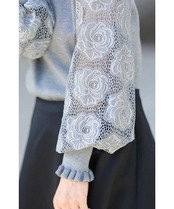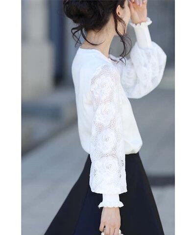 カットソー ニット レディース 初秋 レース 切り替え トップス パフ袖 カットソー ベーシック レース袖 透け感袖 長袖 リブ 柔らかい 着痩せ 女性らしい 大人 春 秋 長袖 通勤 普段着 カジュ