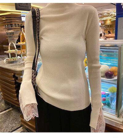 カットソー ニット レディース レース 切り替え トップス レースネック ハイネック カットソー ベーシック レース袖裾 長袖 リブ 柔らかい 着痩せ 女性らしい 暖かい 上品 大人 春 秋 長袖 通
