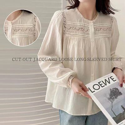 ギャザー ブラウス シャツ レディース コットン 春夏 長袖 レース切り替え トップス シャツブラウス レディース 無地 長袖トップス 長袖シャツ レース 春 秋 夏 春秋 カジュアル パフ袖 パフス