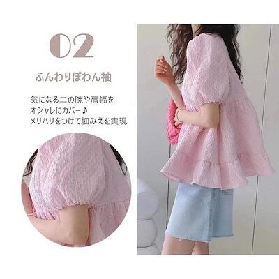 ジャガードブラウス エンボス加工 Aライン 裾フリル ブラウス バルーン袖 大人気 上品 半袖 無地 トップス 春 夏 レディース フレア