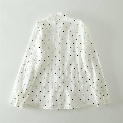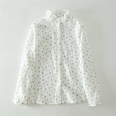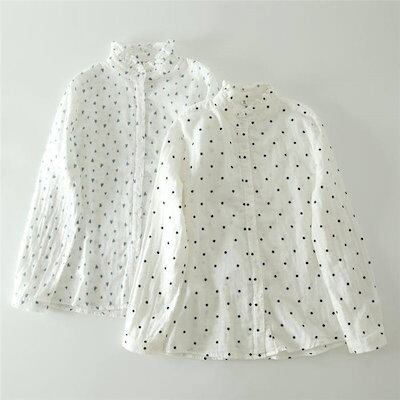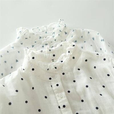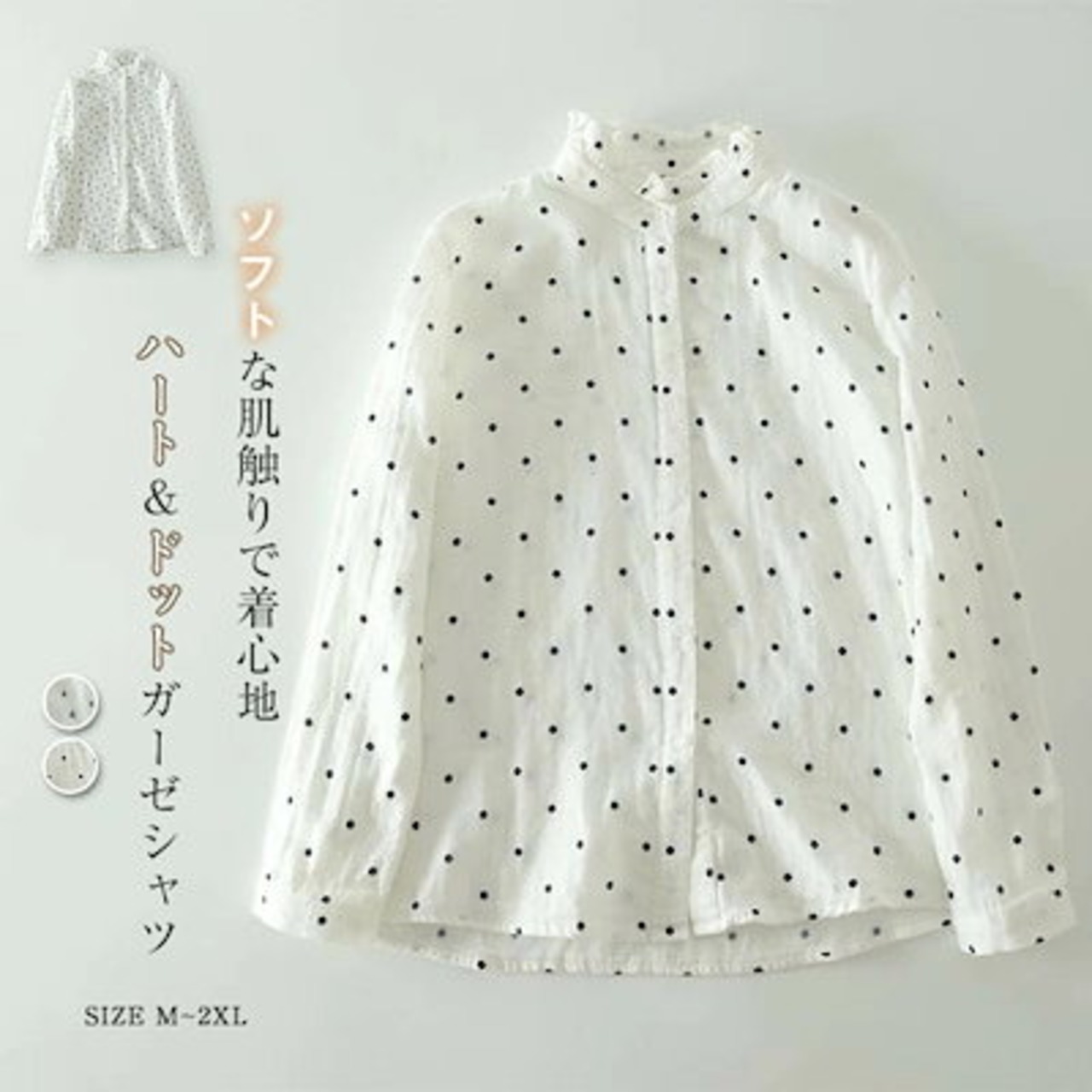 フリル襟 シャツブラウス レディース ガーゼ シャツ 長袖 トップス ドット柄 ハート柄 ダブルガーゼ カジュアル 2重ガーゼ ドット ゆったり 体型カバー 通勤 秋 冬 春 スタンドカラー 着回し