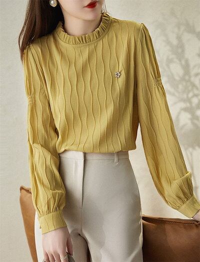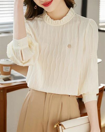フリル衿 ブラウス レディース スーツブラウス 長袖 レディースブラウス 無地 シャツブラウス シフォン ママ スーツインナー 入学式 卒業式 インナー スタンドカラー 立ち襟 パフスリーブ 大人 お