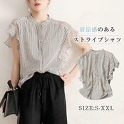 シフォン ストライプ シャツ レディース おしゃれ 夏 シャツ ブラウス 半袖 ブラウス オフィス シャツブラウス レディース おしゃれ 袖口フリル 切り替え 前開き フォーマル オフィス 夏シャツ