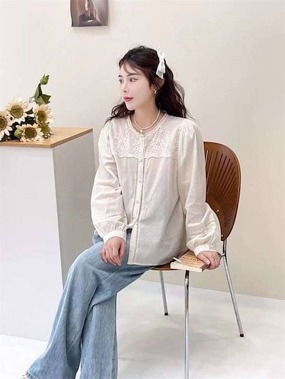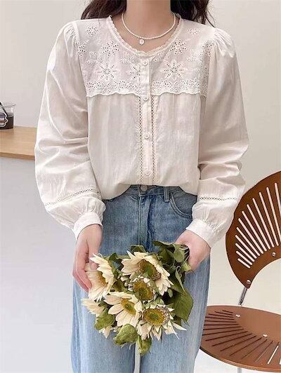 刺繍 シャツ ブラウス レディース 春秋 長袖 フリル襟 可愛い 綿 秋冬 シャツブラウス トップス カジュアル ナチュラル おしゃれ シンプル 通勤 通学 羽織り 春 秋 オフィス お洒落 コット
